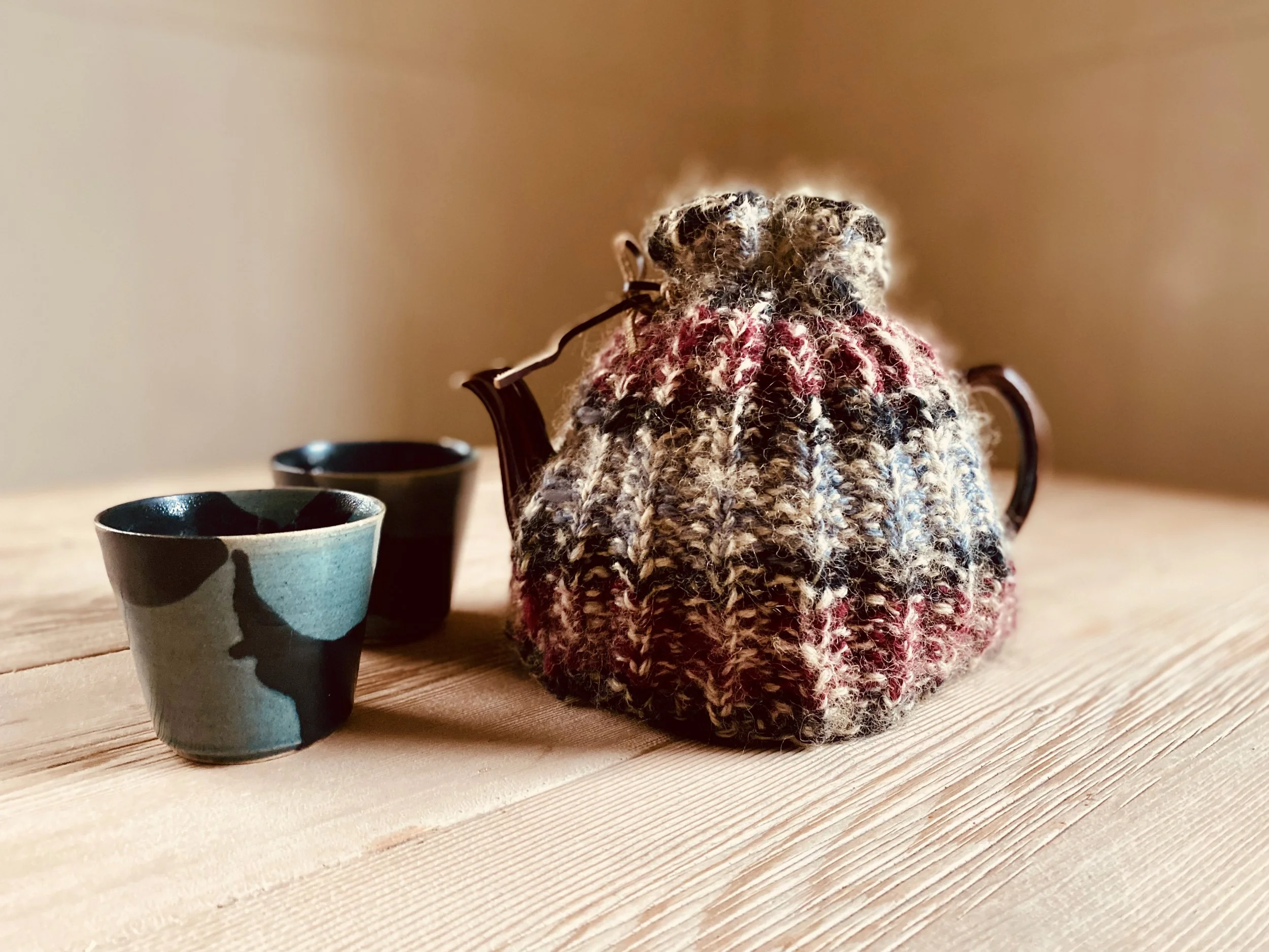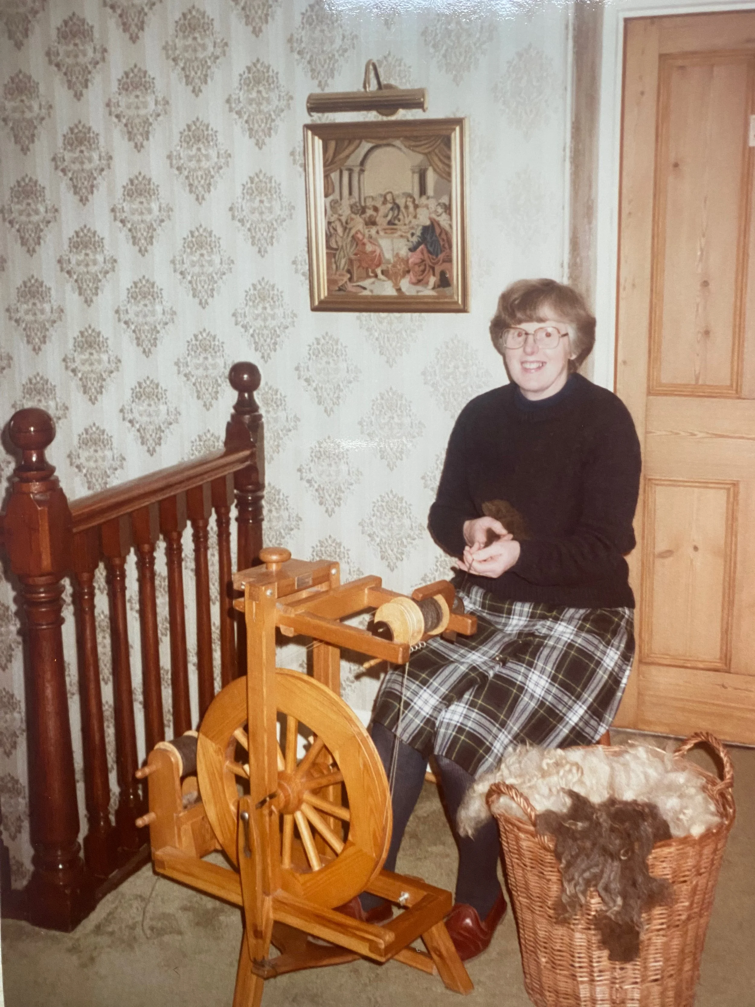 Barbara (born 1932) is a skilled hand at knitting, darning, cooking, mending, tapestry and more; below (left) at her spinning wheel where she spun wool from Botelet sheep (image from 1985), and used the yarn to knit hats and tea cosies, many of which are still in use today - such as the one in the image on the right!