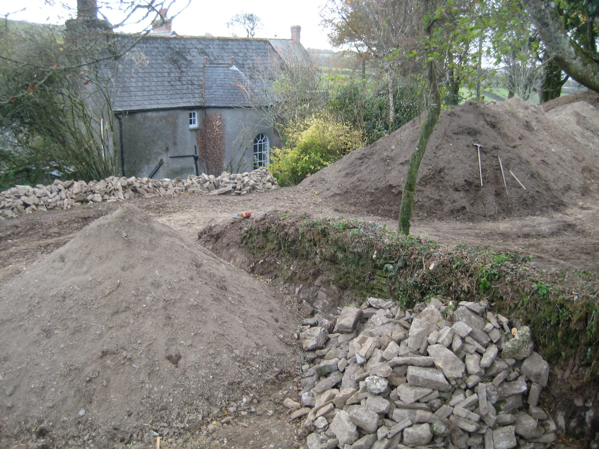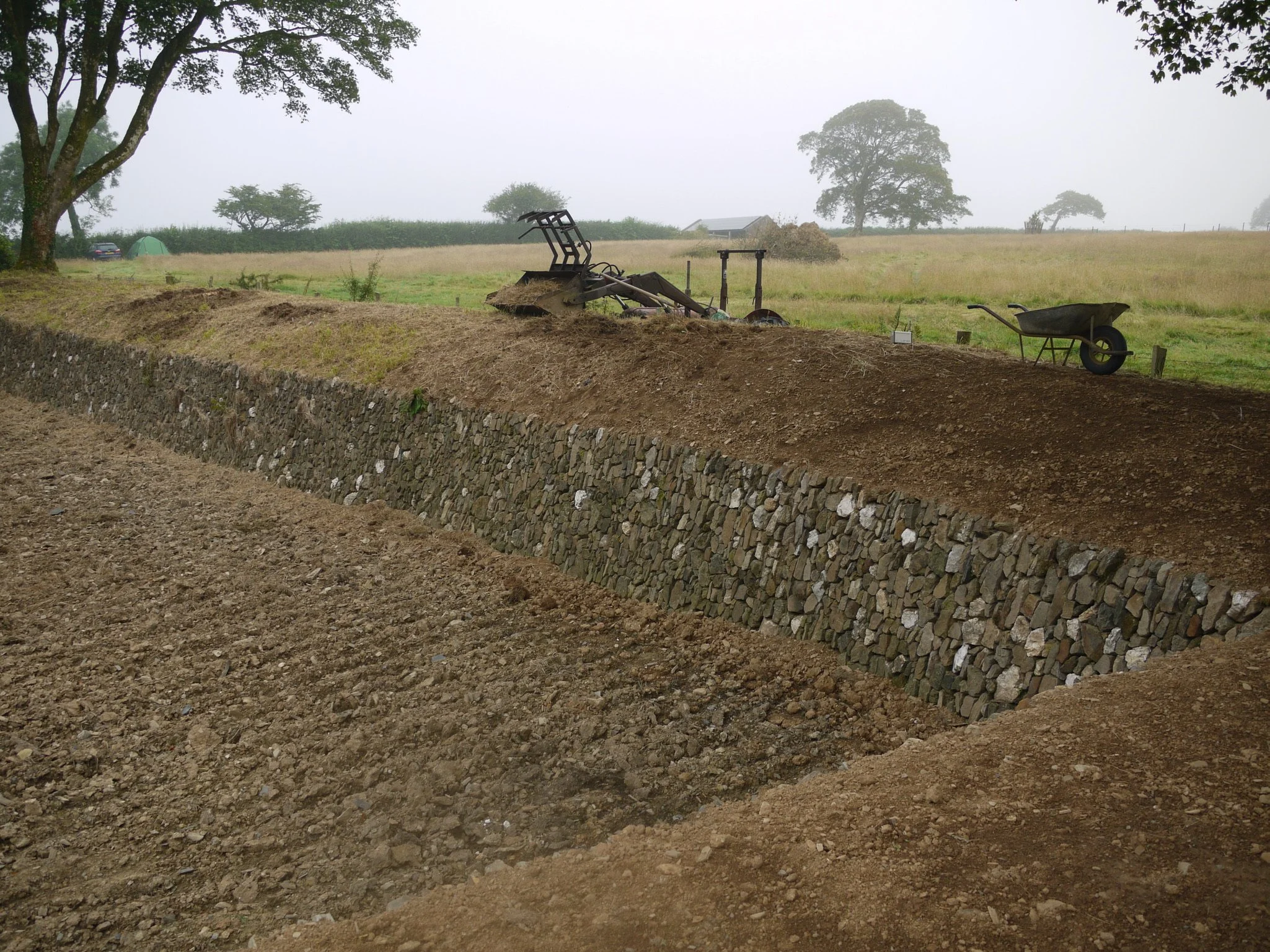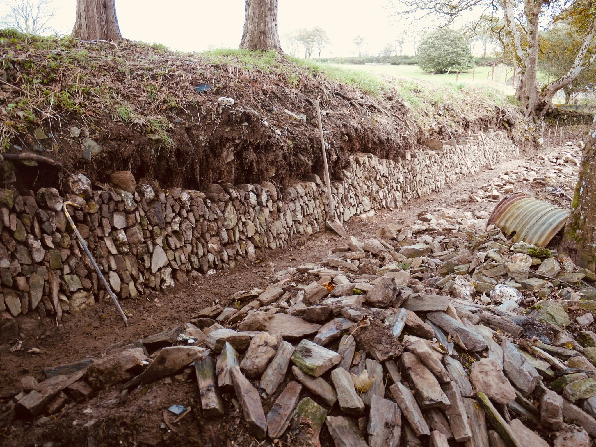 Visitors to Botelet may have noticed the piles of stones in the yard; these have been retrieved from fields during Richard’s decades of work on the land, categorised into piles according to shape, then are re-used during building projects. The historic stone walkway that creates the perimeter of the garden behind Manor Cottage garden was completely rebuilt by Richard in 2012/13, following discussions with local historians about the original lines and heights of the wall (which are noted in the Domesday book), selecting stones appropriate for the base, corners or facing of the wall from the stores in the yard (see images below).